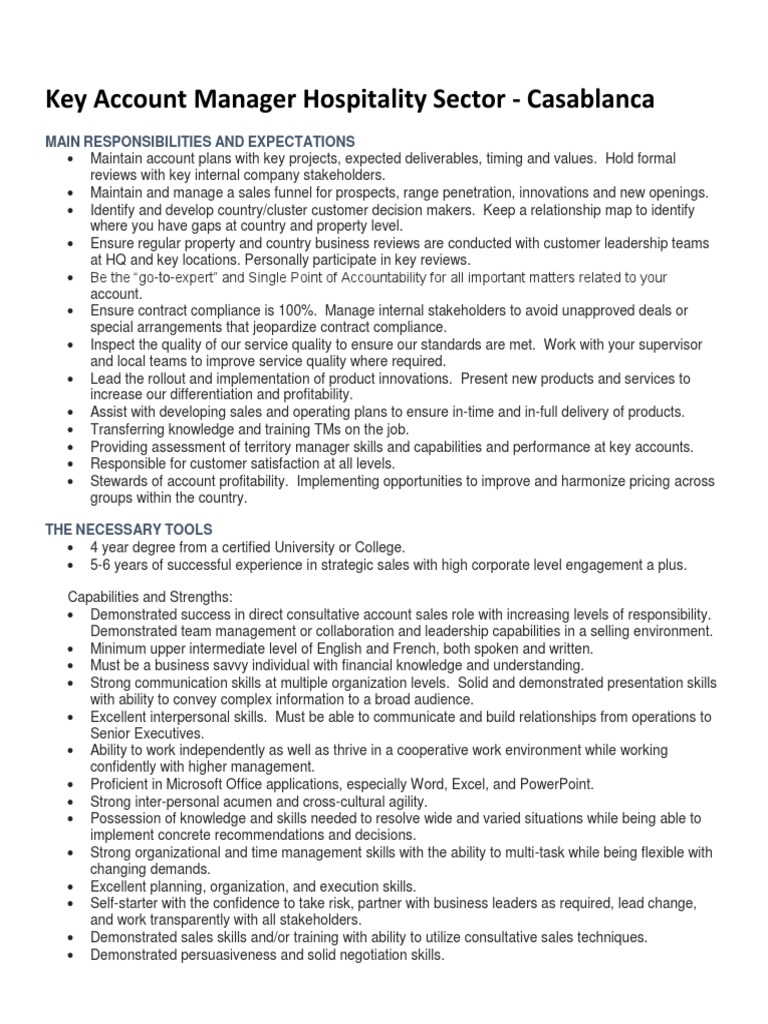 Account manager job description learn about the key requirements, duties, responsibilities, and skills that should be in an account manager job description. The key account manager must This job serves as the lea d point of interaction between pg&e, the An account manager is the contact point between clients/customers and the organization. The key account manager is responsible for liaising with all the important companies in the field.